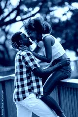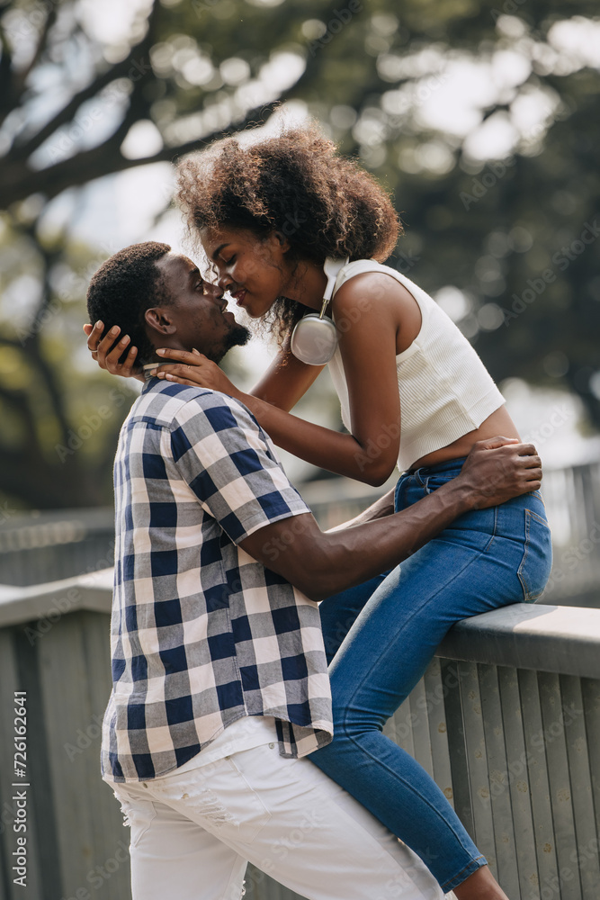 Date couple man and women kiss valentine day. African black lover kissing at park outdoors summer season vintage color tone