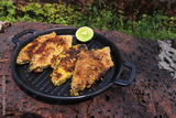 Indian black pomfret fish fry. Halwa Rava fry. Indian Spicy fish fry served on black grill pan. also known as talalele poplet in Marathi. Copy space. Malwani fish fry.
