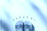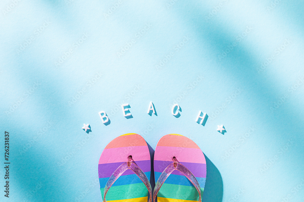 Colorful Flip-Flops and the Word Beach on a Sunny Blue Background Signifying Summer