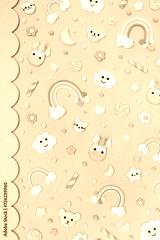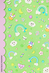 Trendy pastel green kawaii flyer, banner background design template with cute air plasticine handmade cartoon animals, unicorns, stars, rainbows pattern. Top view, flat lay. Candycore, fairycore.