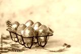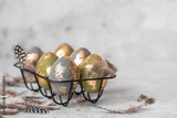 Stylish beautiful Easter eggs with golden enamel and feathers on a gray background. The concept of happy Easter 2024.