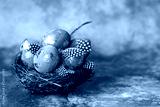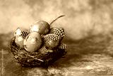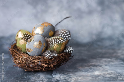 Stylish beautiful Easter eggs with a golden coating of sweat and feathers in a bird's nest of brushwood on a gray background. The concept of happy Easter 2024.