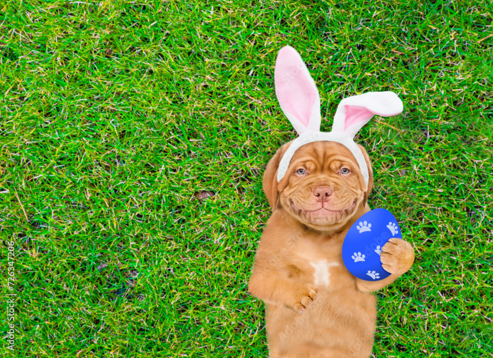 Smiling Mastiff puppy wearing easter rabbits ears holds big painted Easter egg and lies on its back on summer green grass. Top down view. Empty space for text