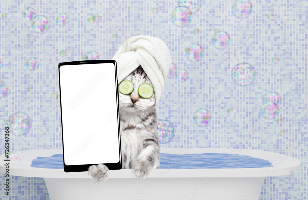 Cute kitten with towel on it head, with pieces of cucumber on it eyes and with cream on it face takes the bath at home and shows big smartphone with white blank screen in it paw. Empty space for text