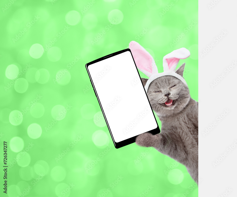 Happy kitten wearing easter rabbits ears holds big smartphone with white blank screen and looks from behind empty white banner on green blurred background