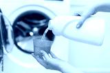 Person adding liquid laundry detergent to the washer, close up. Female hand holding laundry detergent in front of open washing machine