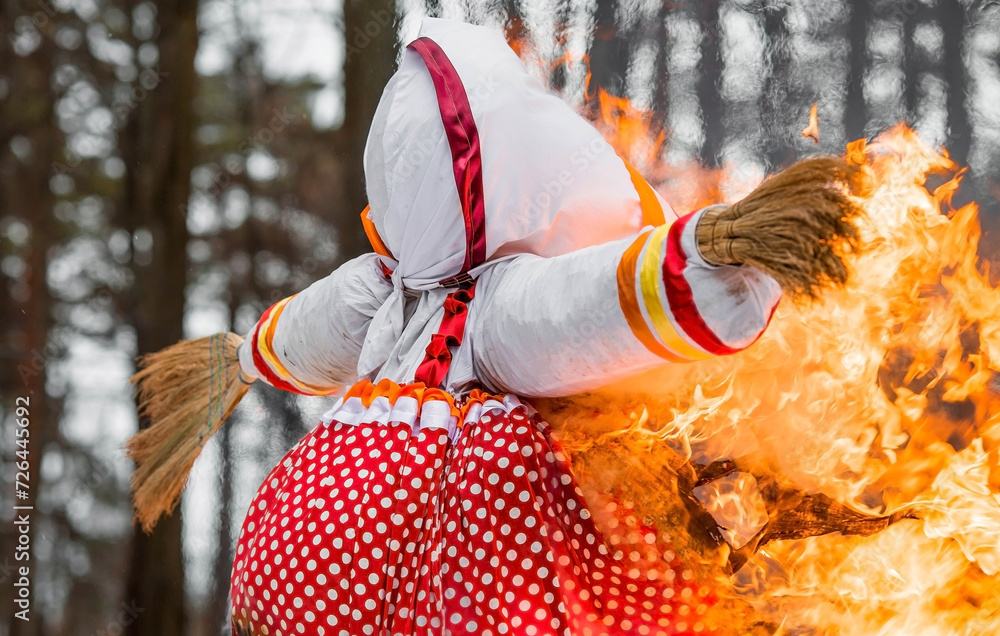 Russian traditions. Shirokaya Maslenitsa holiday. Burning of an effigy of Maslenitsa in the Moscow region. Seeing off winter.