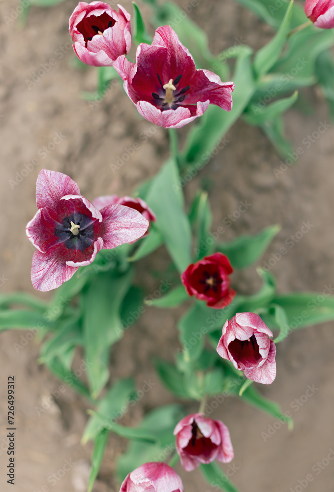 Pink tulips flowers in the spring park close up