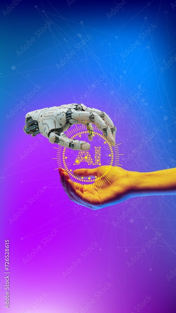 Human-robot cooperation. Promotion for masterclass in AI and machine learning. Conceptual design. Human hand and 3D model of robotic hand on gradient background. Concept of business, technology