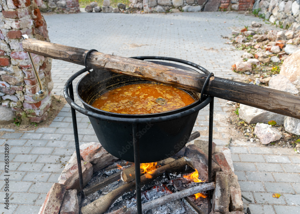 view with pots, cooking festive soup, picnic in nature, historical dishes