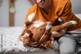 Smiling man with dog. Happy pet owner playing with his Nova Scotia Duck Tolling Retriever at home..