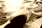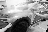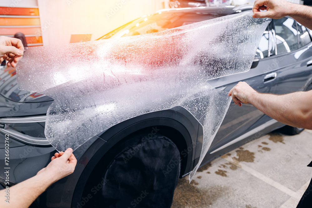 Process of pasting of car with protective vinyl film from gravel chips and scratches. Transparent protection for paint