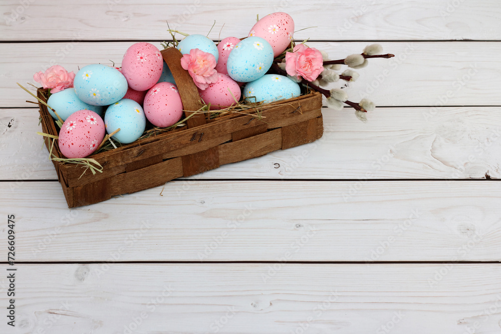 A basket of pink and light blue Easter eggs on a light wood background with space for text.