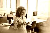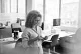 Busy middle aged professional business woman using tab computer in office. Mature lady manager, older female corporate executive holding tablet standing at work, authentic shot. View through glass