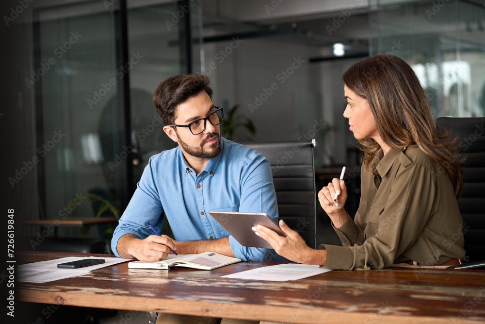 Two busy colleagues working together talking using tab device in office. Middle aged Latin female manager discussing work with young male worker discussing business plan strategy at office meeting.