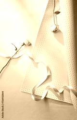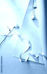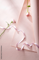 A pastel-toned spot pattern light pink backdrop of pink rose and ribbon, a view of the top, a decorative podium with a flat line. An empty platform for display cosmetic products, food and props.
