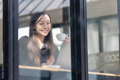 Woman typing on a netbook while working on a new project, Remote work in a modern workspace.
