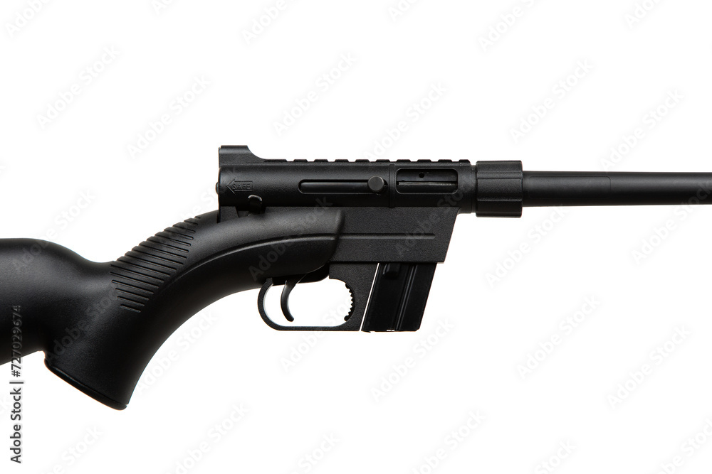 Small-bore bolt rifle in a plastic stock of .22lr. Small rifled weapon for hunting and sports. Isolate on a white back.