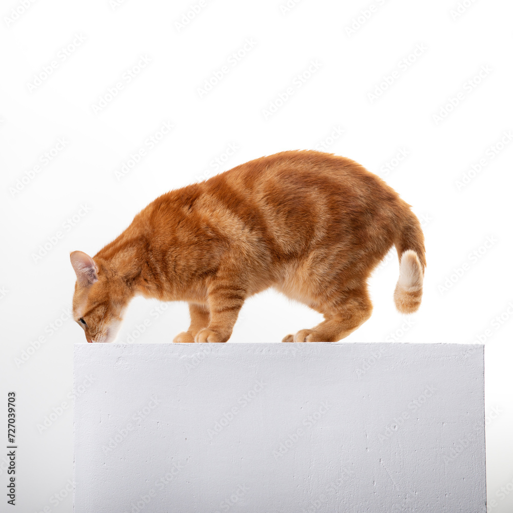 Cute ginger tabby young cat posing and sniffs something at studio over white background