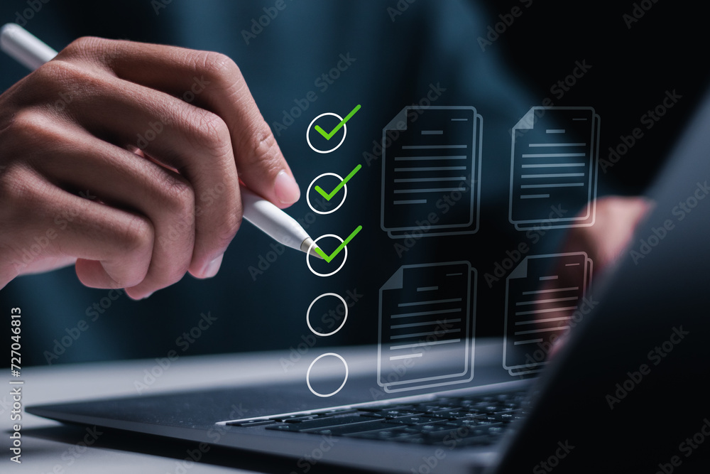 Survey form concept. Businessman use laptop with checking marks on checklist and filling online form, answer questions of test.