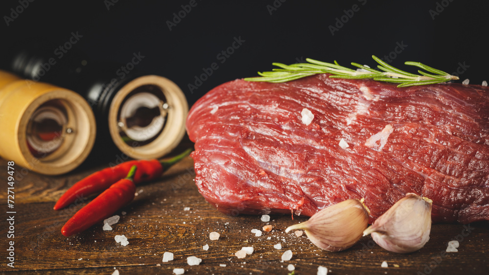 meat with spices on a wooden background