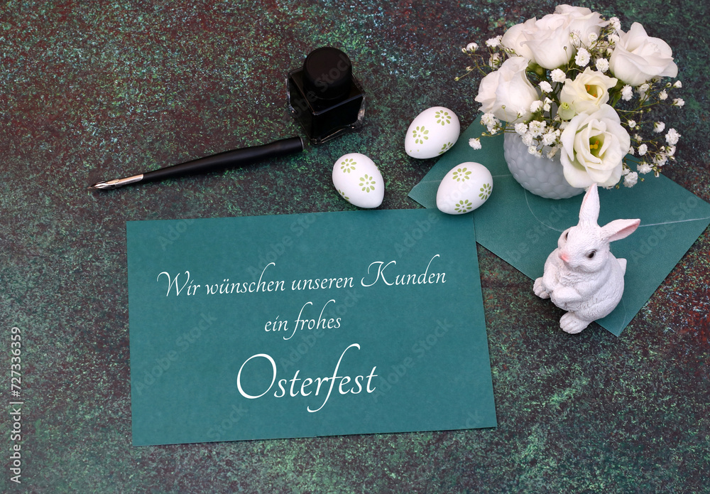 Ostergrußkarte: Brief mit Ostergrüßen und Ostereiern. Wir wünschen unseren Kunden ein frohes Osterfest.