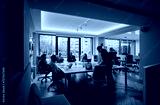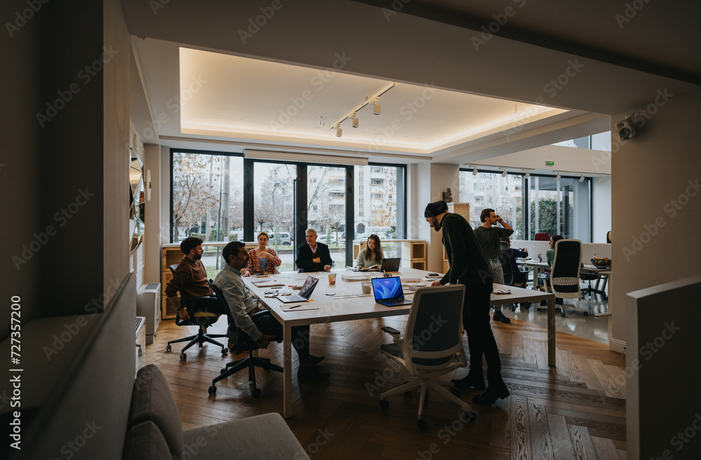 Diversity and teamwork in a modern office setting. A group of professionals sits at a table discussing projects with enthusiasm and focus.