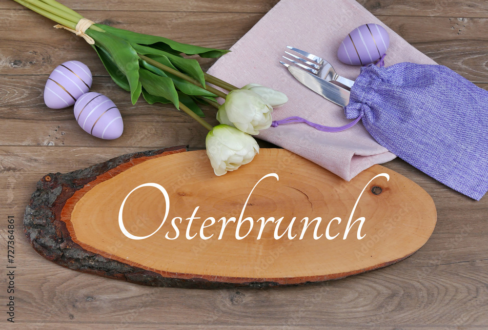 Der Text Osterbrunch auf einer Baumscheibe mit Besteck und Osterdekoration.