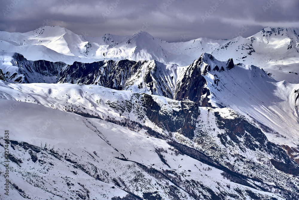 Breathtaking beautiful panoramic view on Snow Alps - snow-capped winter mountain peaks around French Alps mountains, The Three Valleys: Courchevel, Val Thorens, Meribel (Les Trois Vallees), France