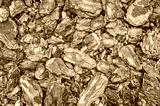 Background, texture of pieces of brown wet after rain coniferous, spruce bark. Photo of nature, top view, close-up, decor.