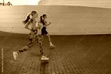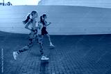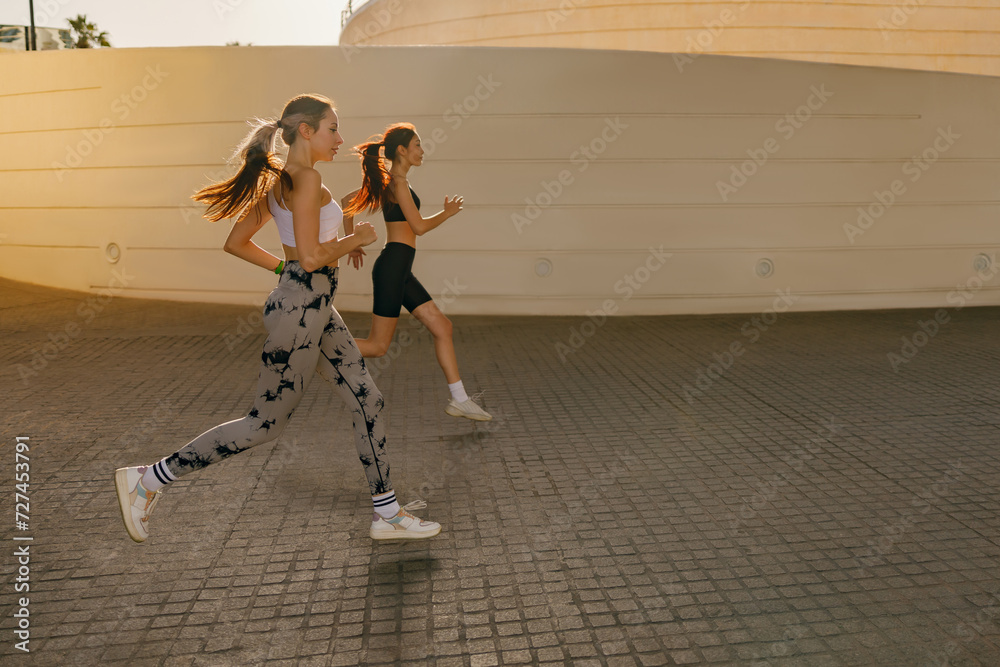 Two women athlete running side by side along an outdoor track on modern buildings background