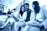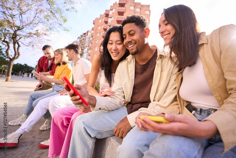Young group of millennial people having fun using cell phone together outside. Cheerful community of student enjoying social media content on smartphone. Multiethnic group of friends watching mobile