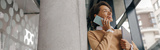 Stylish business woman is talking phone while standing with laptop in modern office
