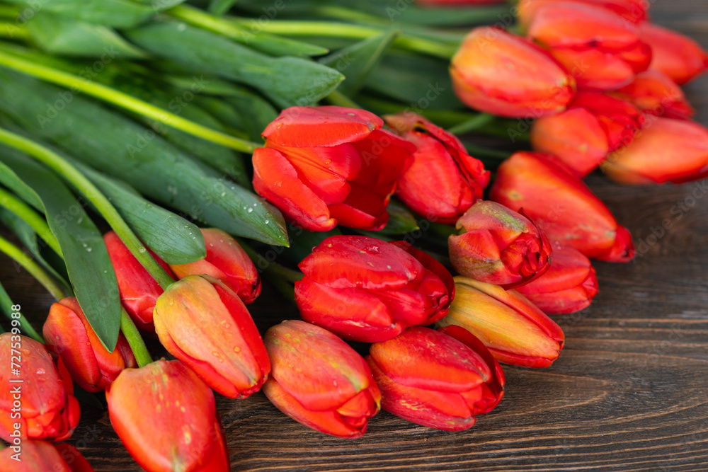 Fresh orange tulips on a wooden background. Springtime. Greeting card with copy space for Valentine's Day, Woman's Day and Mother's Day.