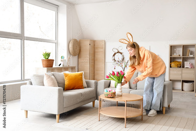 Young woman in bunny ears with tulips at home. Easter celebration