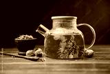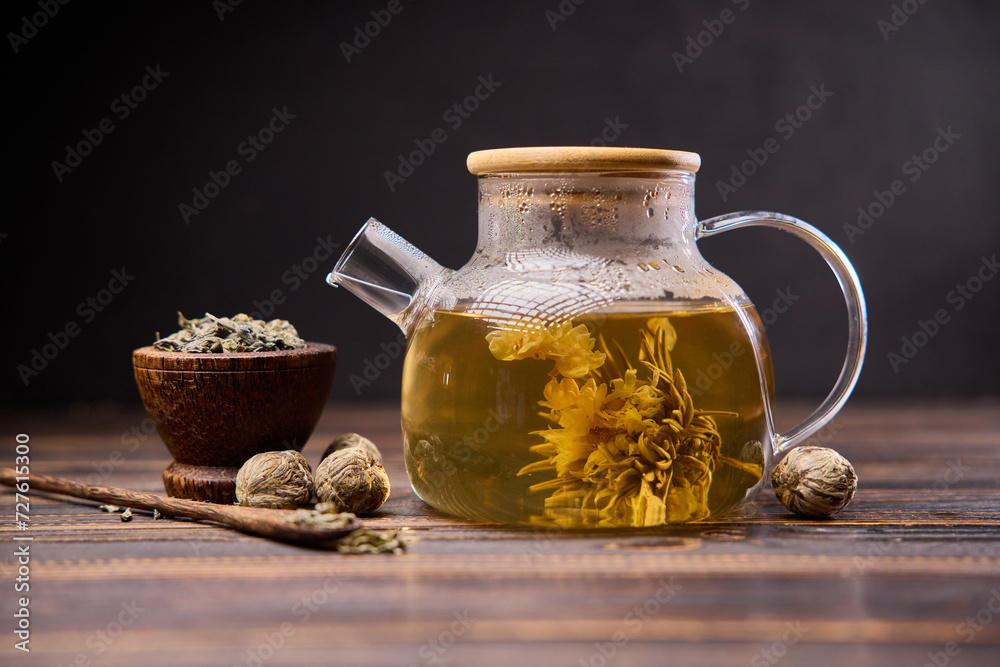 Teapot and glass cup with blooming tea flower inside on a wooden table