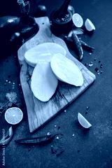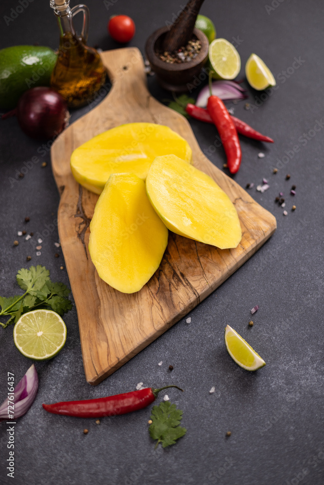 Peeled sliced Tropical mango fruit on a wooden cutting board