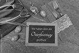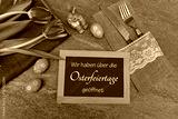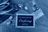 Osterdekoration mit Blumen, Ostereiern, Besteck und dem Text wir haben über die Osterfeiertage geöffnet auf einer Kreidetafel.