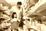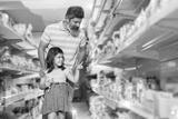 Happy indian father and daughter shopping for groceries at the supermarket.Little girl pointing at the products.