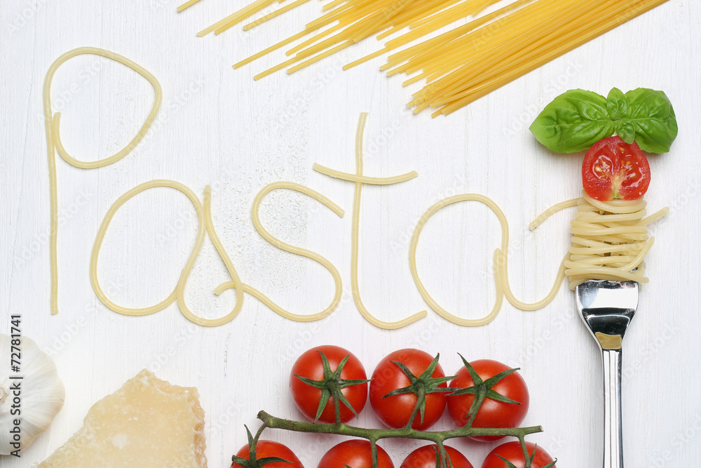 Zutaten für Pasta Spaghetti Nudeln auf Gabel