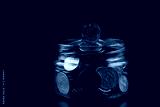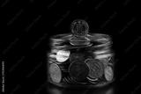 10 Ukrainian hryvnia coin and US coins in a glass jar