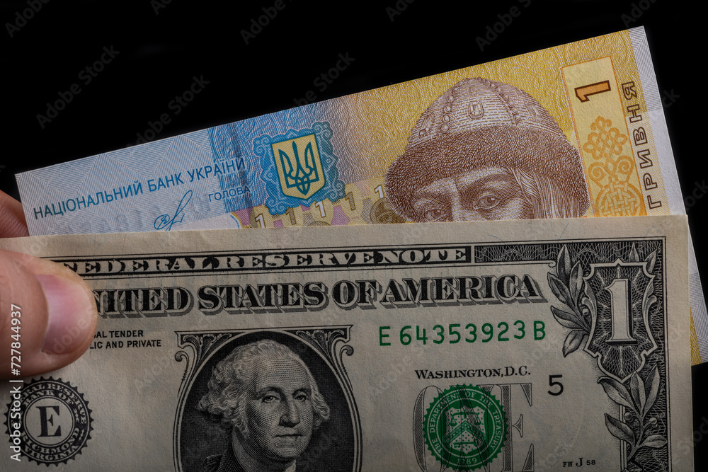 Banknotes in denominations of 1 Ukrainian hryvnia and 1 US dollar