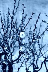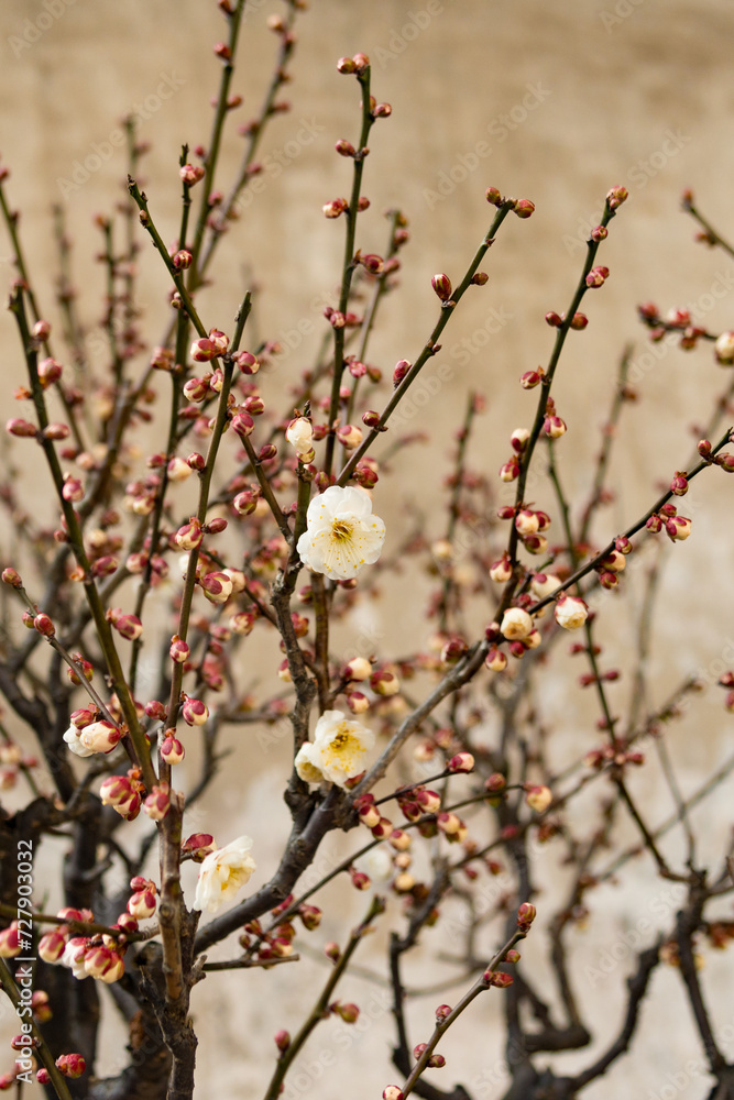 Close up of a Chinese cherry plum blossom with a shallow depth of field in late winter