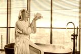 Spa relaxation. Young woman in spa bathrobe sitting at bath blowing foam in bathtub. Girl relaxing in bathroom at home. Female spending morning in bathroom. Beauty treatment body skin care concept