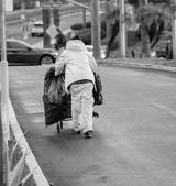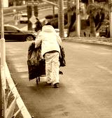 A homeless person in a yellow plastic jacket pushing a shopping cart in the rain