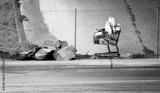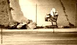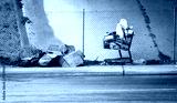 A shopping cart loaded with junk at a homeless camp with wet cardboard boxes nearby
