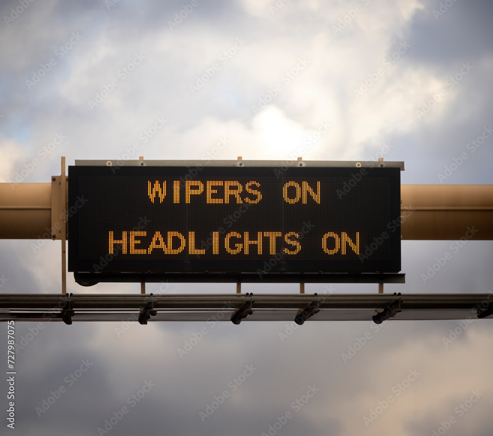 A digital sign on the 15 freeway stating Wipers On - Headlights On to warn of a winter storm. The shot was taken in Escondido California