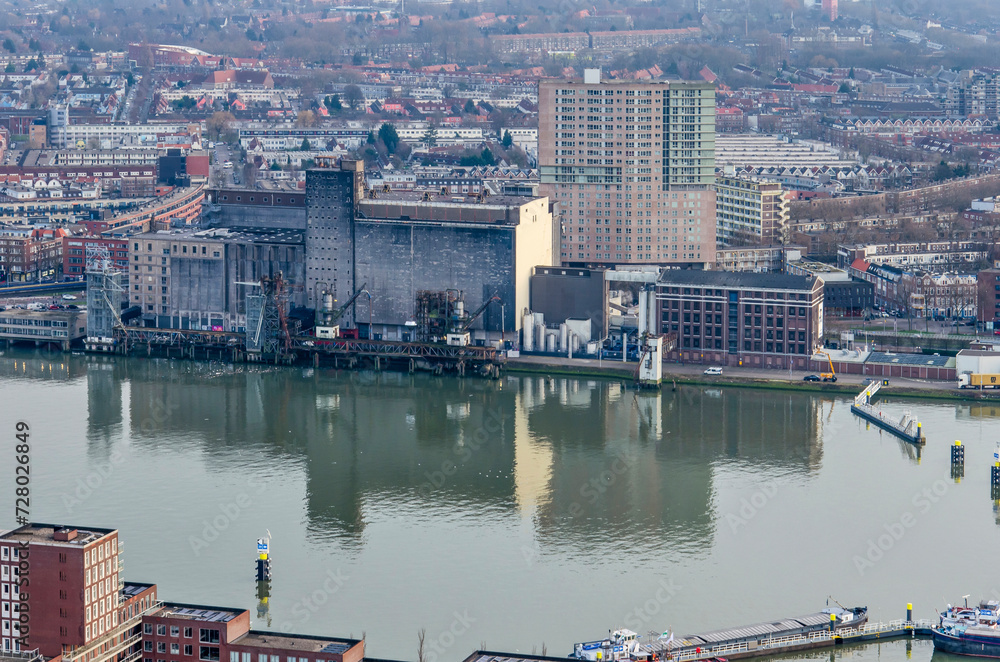 Rotterdam, The Netherlands, January 29, 2024: aerial view across Maashaven harbour with the iconic Maassilo, now a concert venue