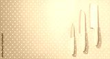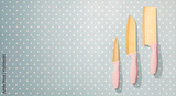 Kitchen Knives With Pink Handles Lined Up on a Polka Dot Background