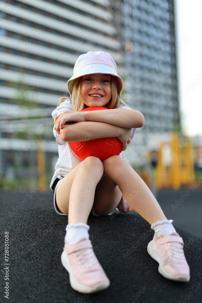 Little girl enjoying a carefree summer day in the park, playing with a ball and smiling.